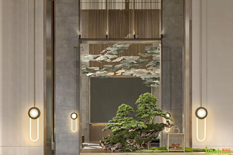 枯樹(shù),在東方文化中是一種古老的美學(xué)意向,寓意生衰。入口處,巍峨高聳的枯樹(shù)將堅(jiān)韌的品質(zhì)注入前廳空間,歷史的風(fēng)云際會(huì)與古往今來(lái)的名流傳奇交融成華麗的篇章,手工藝人用嫻熟的技法將其繪入金色的朝云,室內(nèi)設(shè)計(jì)師以千山獨(dú)行的傲然風(fēng)骨層層席卷著感官與知覺(jué),本真的智慧和美褪去了一切凡俗形跡。