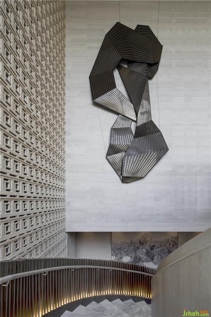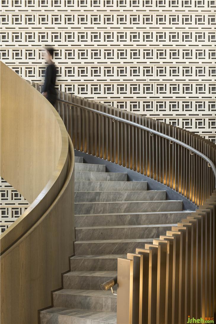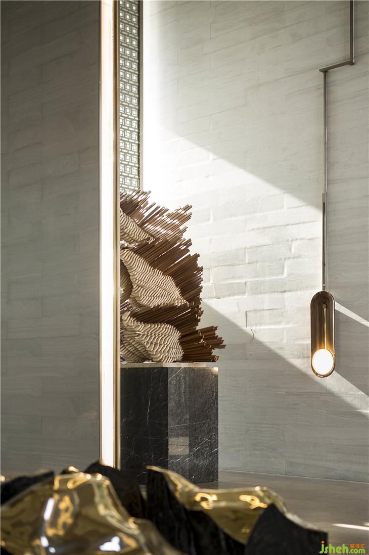 沿著動線行進(jìn)、轉(zhuǎn)移,步入會所區(qū),域漏窗式的墻體緊密連結(jié)室內(nèi)的景觀樓梯與室外的秀木綠林,一步易景,移步亦景。古銅色的旋轉(zhuǎn)樓梯運(yùn)用不對稱設(shè)計(jì),一面是不銹鋼材質(zhì),一面是疏密有序的木柵,自然的質(zhì)感與藝術(shù)的精奢融為一體。而藝術(shù)吊燈則像是翠玉質(zhì)地的黑膠唱片,唱針沿音軌悄悄回旋,細(xì)細(xì)呢喃著萬物生長的聲音。室內(nèi)設(shè)計(jì)師