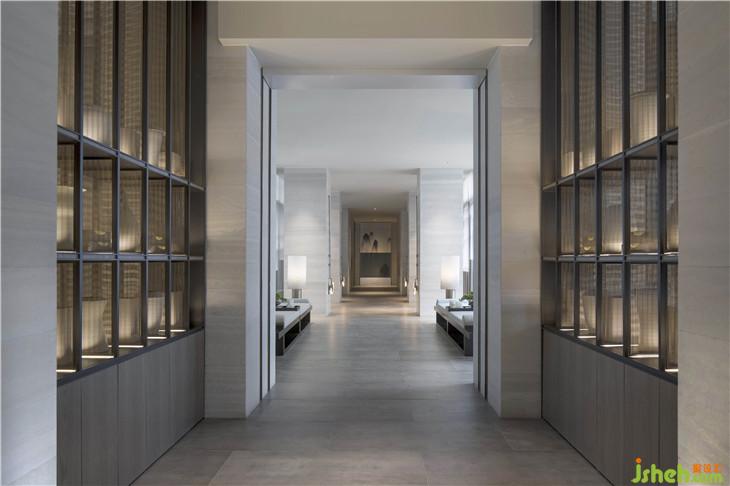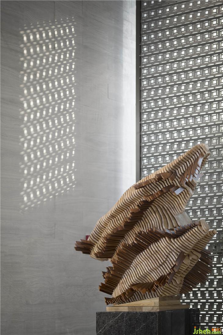 設(shè)計(jì)師在空間的回溯中探索本質(zhì)與源泉,從干練的線條到藝術(shù)化的裝飾,無一不透露著精致與唯美的氣息。濃郁東方色彩的圖案將神秘氣息氤氳在空間里。前臺的若翡翠玉墜般的藝術(shù)吊燈,菱形切割的表面流光溢彩,近看似月光下的湖面漾起的粼粼漣漪。自然的質(zhì)感與藝術(shù)的氣質(zhì)在此融為一體。