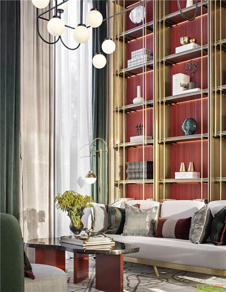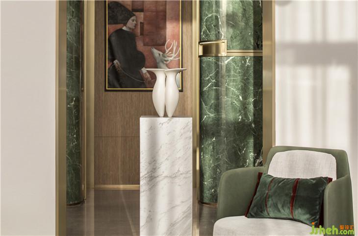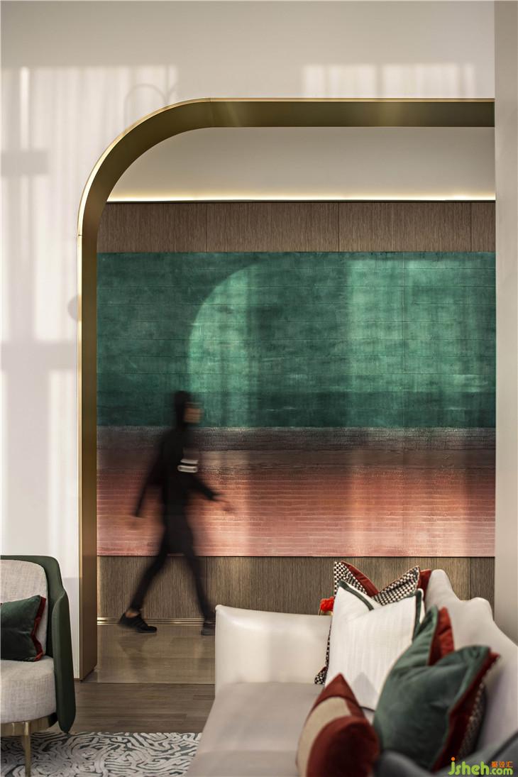 水吧區(qū)呼應(yīng)了翡翠主題,零星翡翠綴滿幾何裝置,以點、線構(gòu)筑面的意象,愈是簡單,愈是呼喚起人與自然的靈魂共鳴。設(shè)計師以幾何元素凝聚空間,傳達(dá)美學(xué)奢華的生活態(tài)度。