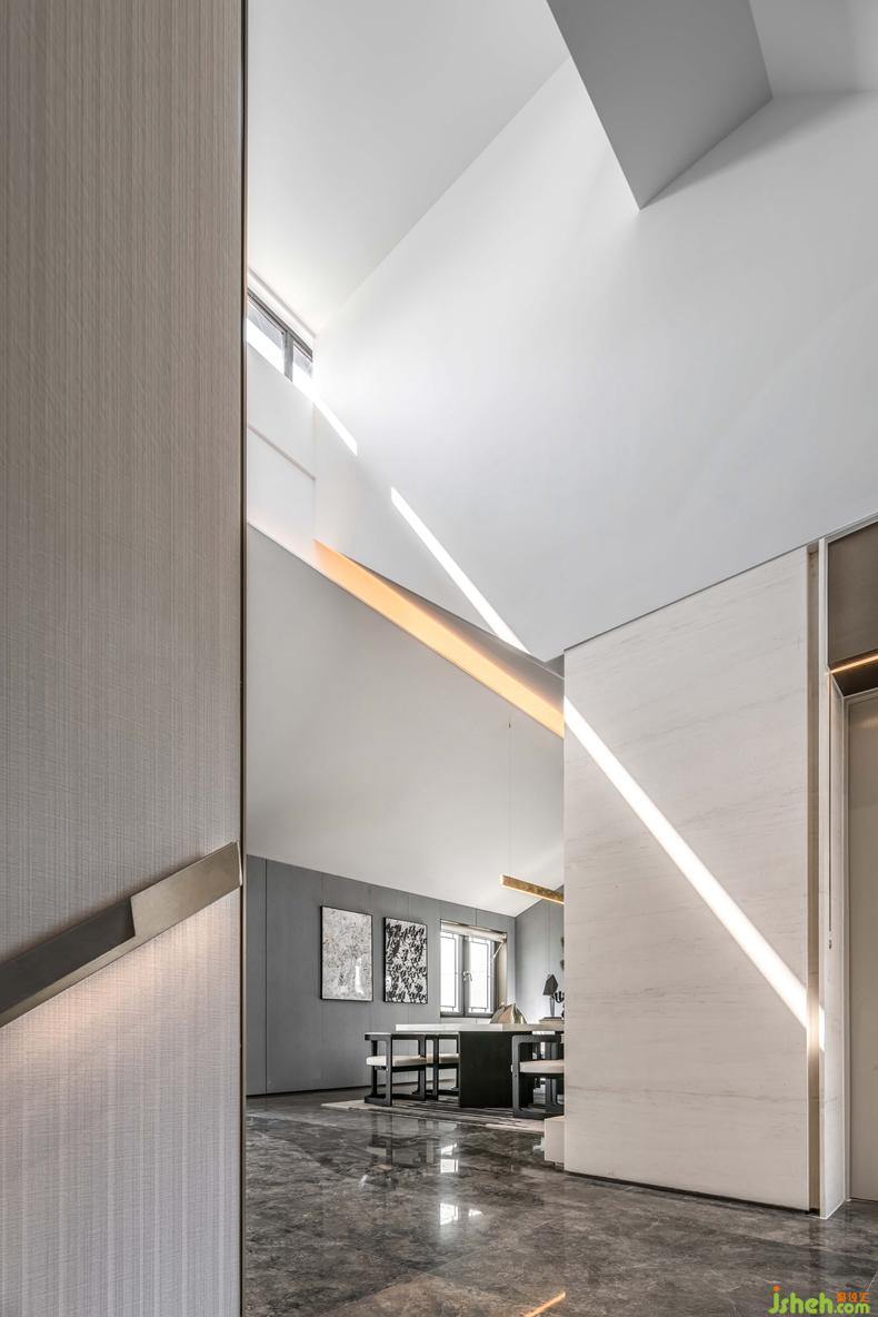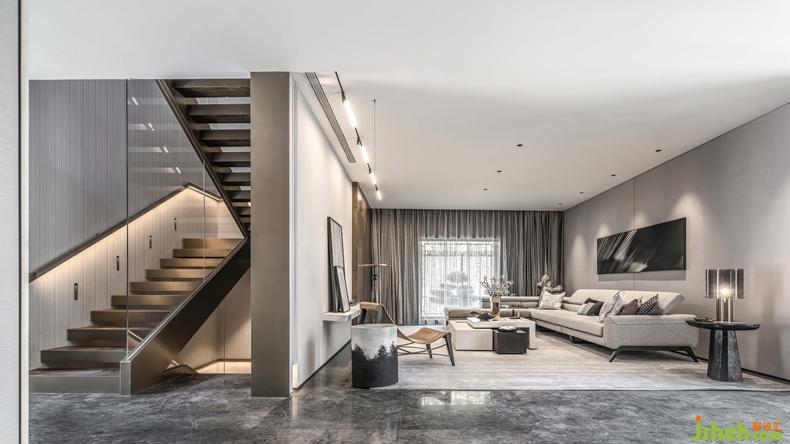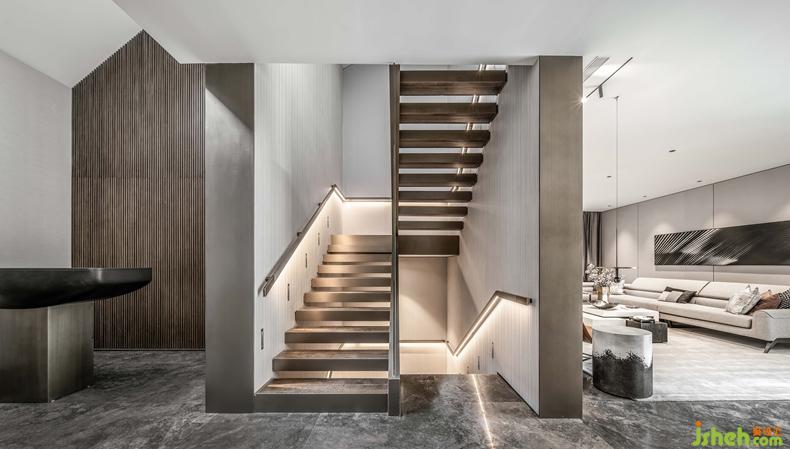 挑高的樓梯區(qū)將精致的生活格調(diào)層層鋪開(kāi),利落的線(xiàn)條伴隨暖色光線(xiàn)充盈其中,表達(dá)精致的空間訴求。金屬材質(zhì)的冰冷在人與人的連接中,帶來(lái)一絲暖意與高雅之感,串聯(lián)起室內(nèi)的情感主線(xiàn)。別墅裝修設(shè)計(jì)