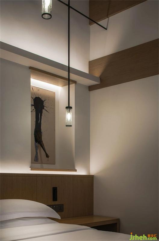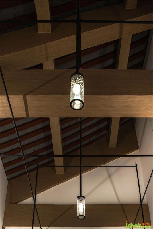 客房既有的瓦片坡屋頂及梁的仿古效果并不理想,有些拙劣,設(shè)計(jì)采用淺色橡木對(duì)梁柱進(jìn)行了新的裝著,梁柱之間的空間加入線形吊燈高低錯(cuò)落的排列達(dá)到弱化瓦片屋頂瑕疵的作用