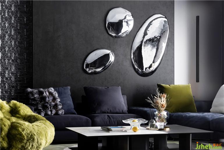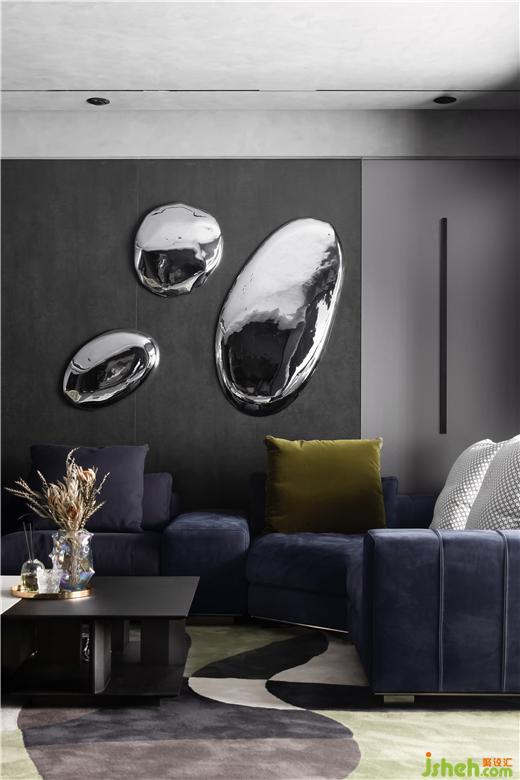 背景墻的銀色水滴裝置以其獨(dú)特的造型成為絕對的視覺焦點(diǎn),為空間營造出個性十足的前衛(wèi)感。細(xì)膩觸感的沙發(fā)、毛絨質(zhì)感的座椅搭配異形地毯,透露出家的溫度。材質(zhì)的碰撞,形式的大膽讓空間獨(dú)特又有趣。
