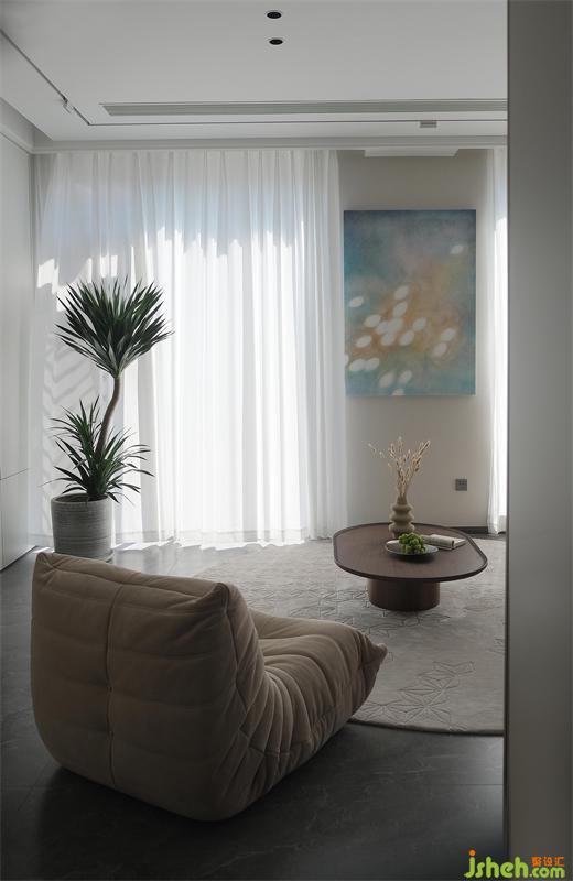 橢圓形的茶幾顯得品質(zhì)有格調(diào),映襯著地毯的紋理感,延伸到墻面掛著的日光藝術(shù)畫,讓空間靈動而不呆板,一入室便被吸引。