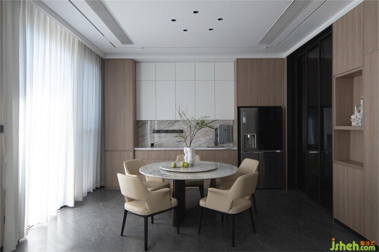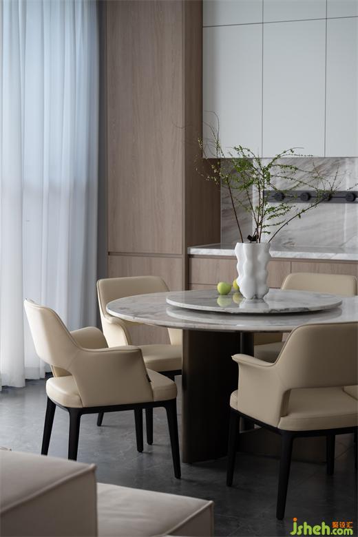 圓形的餐桌,米白色的餐椅,別墅裝修設(shè)計(jì)所有的設(shè)定均以生活動(dòng)線與習(xí)慣來(lái)模擬并加入豐富的創(chuàng)意量身訂做,在這里獨(dú)自品酌或與親朋對(duì)飲,情思爽然,便是人間樂事。