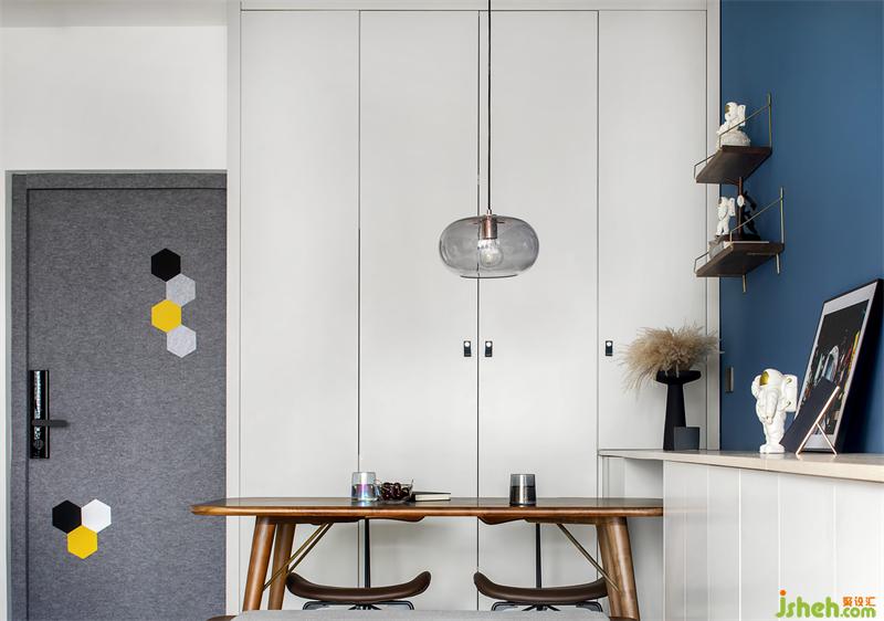 2.面對(duì)收納的問(wèn)題 把公共空間的收納整合到墻面空間,形成了一個(gè)長(zhǎng)達(dá)6米的懸掛壁柜,懸掛的原因是讓空間輕盈通透,臥室的收納以滿足當(dāng)下需求的使用,特意預(yù)留出小房間做衣帽間的儲(chǔ)物容量,也為后期迎接寶寶的到來(lái),預(yù)留足夠的玩??臻g;