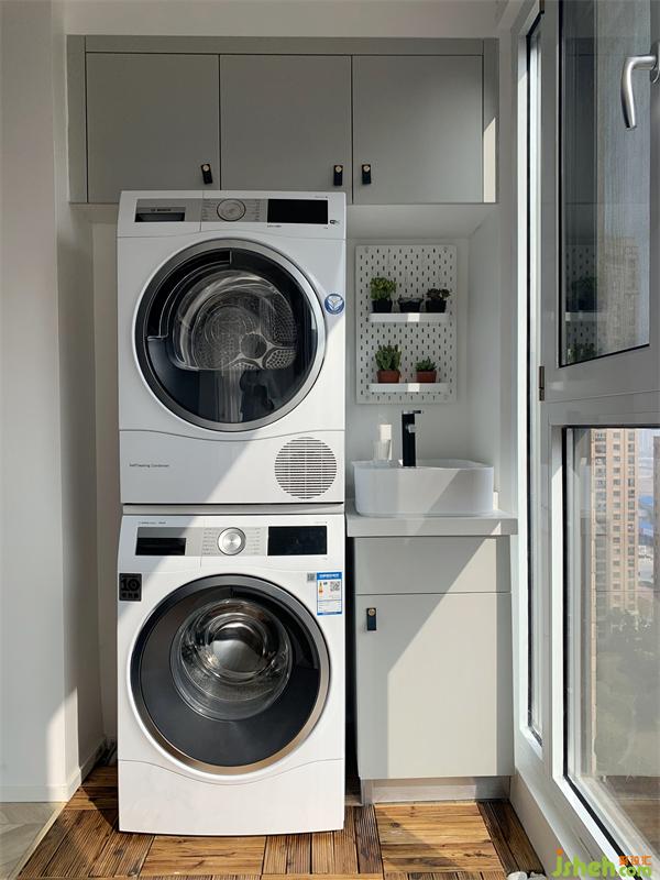 陽臺再小也要有收納及顏值的存在.陽臺鋪設戶外木,搭配小鵝暖石;