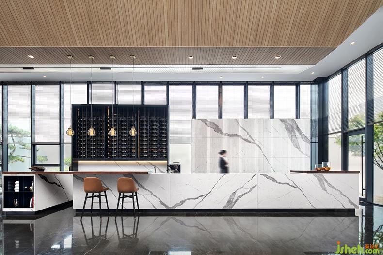 接待總臺(tái)與水吧區(qū)合二為一,不同材質(zhì)與紋理經(jīng)過(guò)別出心裁的組合,凸顯質(zhì)感與品味。