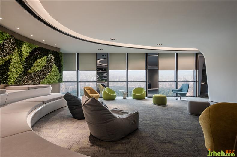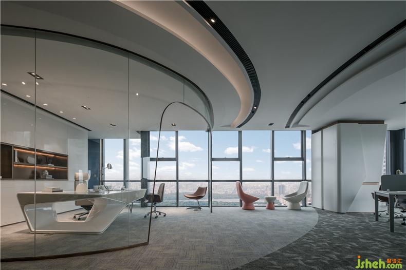 透亮的玻璃窗,爭取自然光最大限度的滲透量,引進外景,城市的日與夜變成室內一幕,將城市之景盡收眼底。同時將獨立辦公室與開放辦公區(qū)隔開,但又保留兩者之間的互動性,拉近管理層與部門員工之間的距離,鼓勵彼此在舒適自然的氛圍中研究與討論,收獲信息,激發(fā)靈感,亦可在工作之余放松休憩。