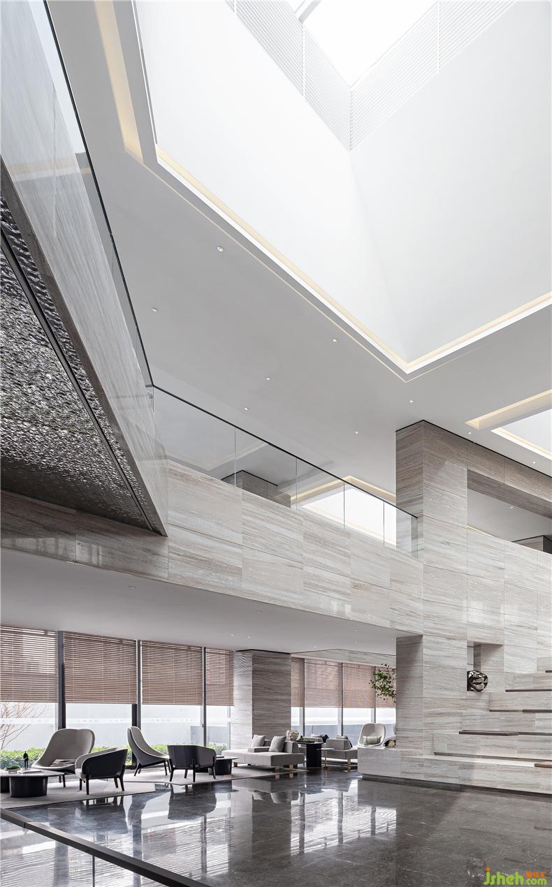 光從天頂灑下,中庭的天光階梯成了最亮眼的存在,青島會(huì)所設(shè)計(jì)層高達(dá)10米的共享空間,木紋大理石從墻面蔓延至臺(tái)階,其中鑲嵌雕塑點(diǎn)綴,形如靜謐、安然的“歸巢”,成為空間的精神象征,為空間注入藝術(shù)感,無(wú)形中拉近人與人的關(guān)系。