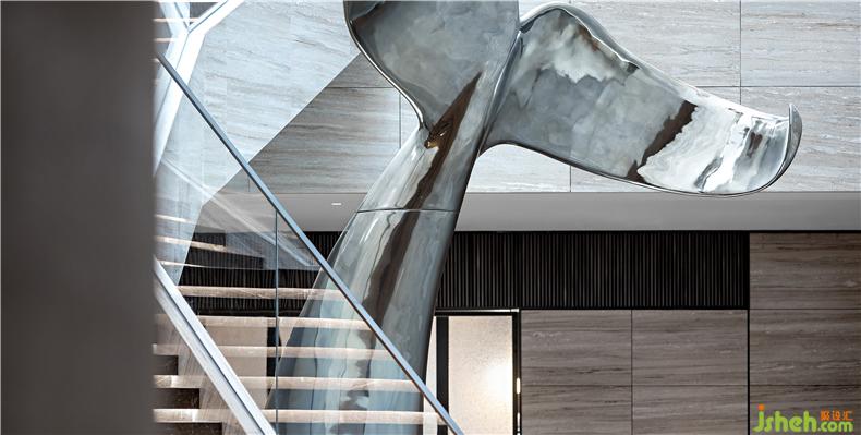 沿樓梯而下,大型鯨魚(yú)尾藝術(shù)雕塑,仿佛一頭扎入地下的鯨魚(yú)在擺尾,自由且獨(dú)一無(wú)二,并具有著生生不息的生命力,在靜謐的空間中,演繹著自然藝術(shù)所富有的巨大視覺(jué)沖擊力。