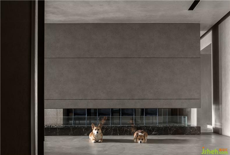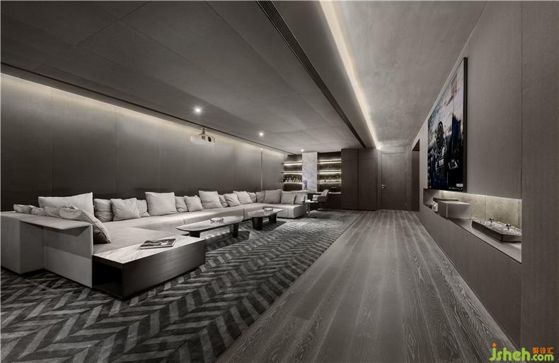 過(guò)道是臥室與客廳的承上啟下的空間,為了減弱灰色帶來(lái)的乏味,會(huì)所設(shè)計(jì)利用地?zé)舻墓庥埃蛟斐领o內(nèi)斂的空間環(huán)境。