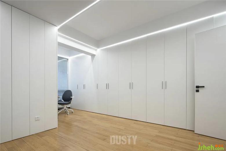 主臥房門裝修公司改為朝向客廳,使之南北空氣形成對流。整個空間無多余的造型,滿墻衣柜從地到頂無接縫,空間得到最大釋放,收納功能做到最大化。