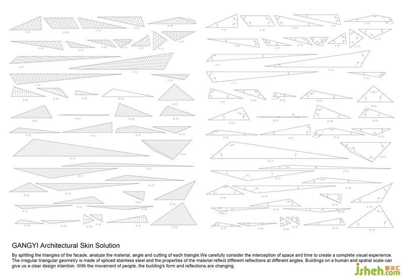 我們細(xì)細(xì)考慮對(duì)于空間和時(shí)間的截取,營造完整的視覺體驗(yàn)。不規(guī)則的三角形幾何體由軋花不銹鋼拼接而成,材料表面的處理, 通過天氣環(huán)境的變化建筑表皮也隨之變化,材料的特性在不同的角度呈現(xiàn)不同的反射,也就是當(dāng)代語匯的多樣性。以人與空間的尺度來講建筑能使我們室內(nèi)設(shè)計(jì)師更清楚設(shè)計(jì)的意愿。隨人的走動(dòng)建筑的形體及反射都在產(chǎn)生變化,在不尋常的集合矩陣中發(fā)揮作用,保護(hù)自然力量對(duì)空間的參與,讓“人”也能活真正成為空間靈活的局部構(gòu)件,形成輕與重、動(dòng)與靜的不同維度多樣性。