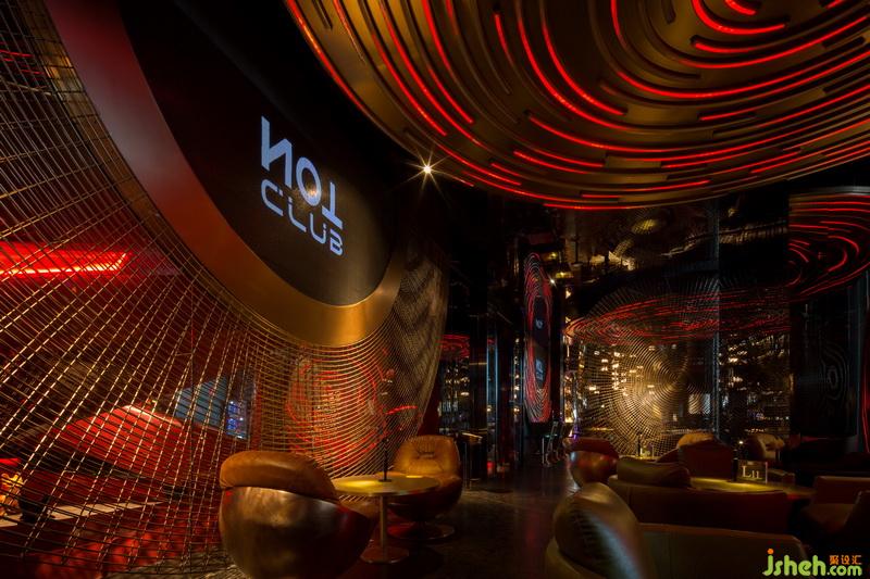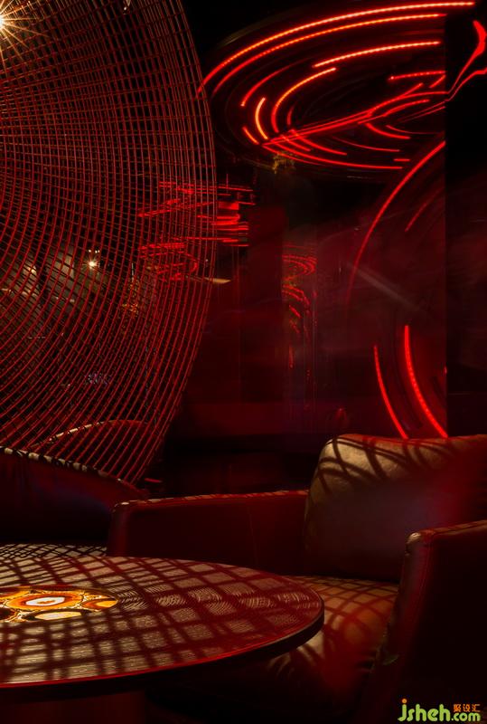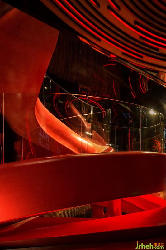酒吧進(jìn)門就可以看見(jiàn)巨大的“黑膠唱片”飛碟穿插縱橫于整個(gè)酒吧外部公共空間。這些飛碟由仿銅不銹鋼制成,飛碟互相重疊交錯(cuò),連綿的唱片有高有低,虛實(shí)結(jié)合,飛碟上的燈帶隨著音樂(lè)節(jié)奏而變化,帶動(dòng)著整個(gè)空間一起躍動(dòng)起來(lái)。在設(shè)計(jì)上,為了讓體驗(yàn)者能夠體驗(yàn)主廳的氛圍,相應(yīng)的在唱片上增加了LED屏幕,能夠與主廳播放的主題畫(huà)面同時(shí)顯示。