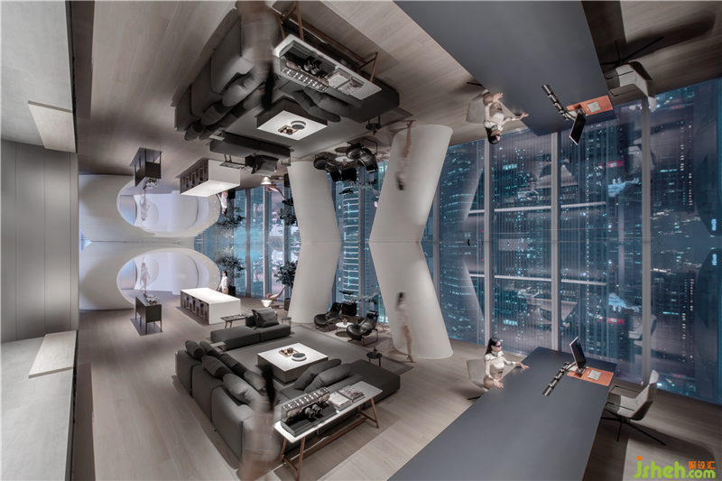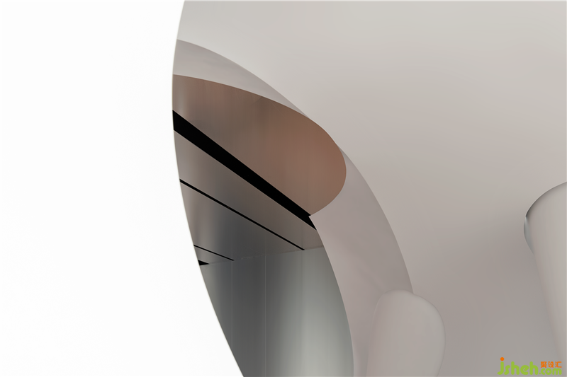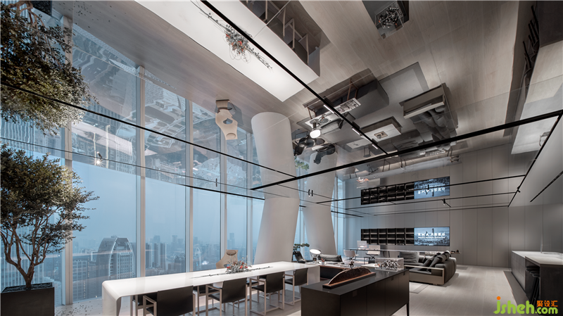 會(huì)議室是整個(gè)空間演奏旋律的變奏,這是一個(gè)不受束縛且打破傳統(tǒng)規(guī)則的空間。我們?cè)诳臻g中置入一個(gè)白色不銹鋼的球體藝術(shù)裝置,宛如一艘星際飛船降臨于此,充滿無限的想象力和神秘感。此球體內(nèi)部能承載常規(guī)的會(huì)議需求,其中4.8M×2.7M的巨型LED屏幕和多媒體設(shè)備鑲嵌于內(nèi),將浩瀚的思想無限延伸。