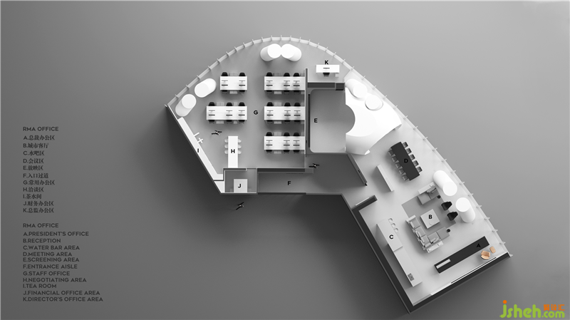 基于辦公室內(nèi)有多個工作小組,且小組成員需要同時辦公的情況,此區(qū)域的設(shè)計旨在提供使不同團(tuán)隊成員能同時享用的共享型空間,團(tuán)隊成員可以在此進(jìn)行不一樣的溝通討論工作,其目的為了能創(chuàng)建一個能使人真正放松身心,自由工作的辦公空間。一個有能力吸收辦公行為中,各種變化需求并靈活做出調(diào)整的生動多樣的空間氛圍:有彈性,自發(fā)應(yīng)用,具備延展性與適應(yīng)力。辦公室設(shè)計