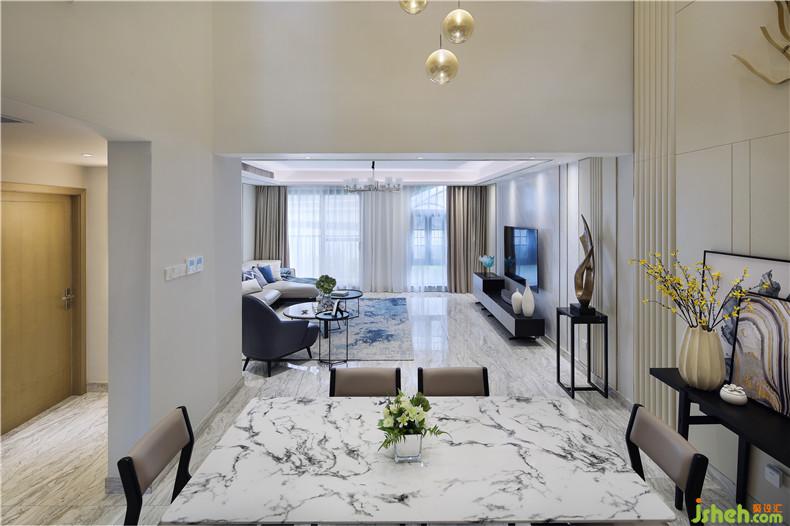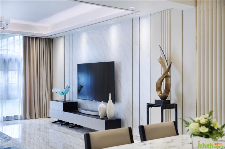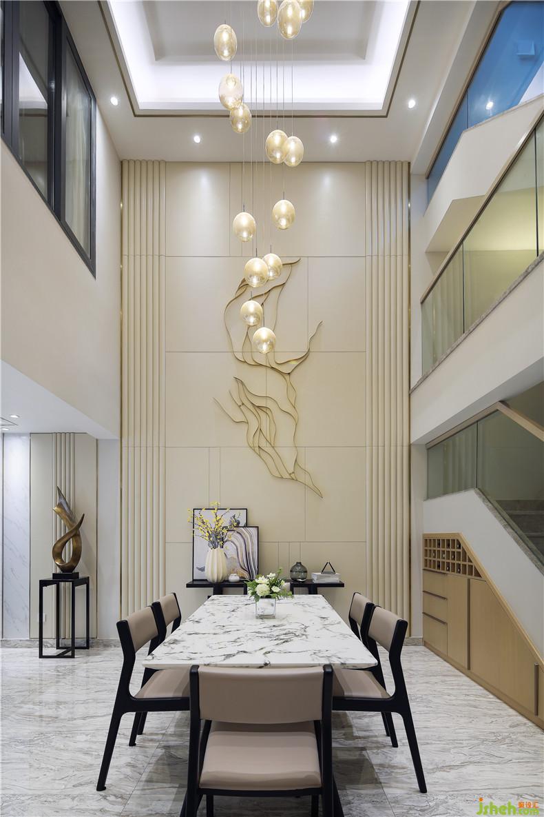 空間設(shè)計(jì)理念上主張用豎線條來(lái)切分過(guò)于矮、扁、寬的立面空間,拉升層高;有規(guī)律的弧形豎條 作為間隔,兩種線條的碰撞讓整體空間既規(guī)整、利落而又不顯呆板。材質(zhì)上選擇皮質(zhì)硬包及金屬線條,精細(xì)工藝為其特征,強(qiáng)調(diào)品質(zhì)感及細(xì)節(jié)的處理??臻g搭配上突出硬裝到軟裝的元素延伸,比如地板磚面的水墨質(zhì)感的律動(dòng),客廳裝飾畫(huà)里的蜿蜒曲線,挑空餐廳背景的鐵藝裝飾掛件呈現(xiàn)的不規(guī)則弧線的相交等等細(xì)節(jié)都強(qiáng)烈?guī)С隹臻g整體的調(diào)性,不為裝飾而裝飾,所有的都是恰到好處的點(diǎn)綴,營(yíng)造的空間氛圍是非常突出和自然的。
