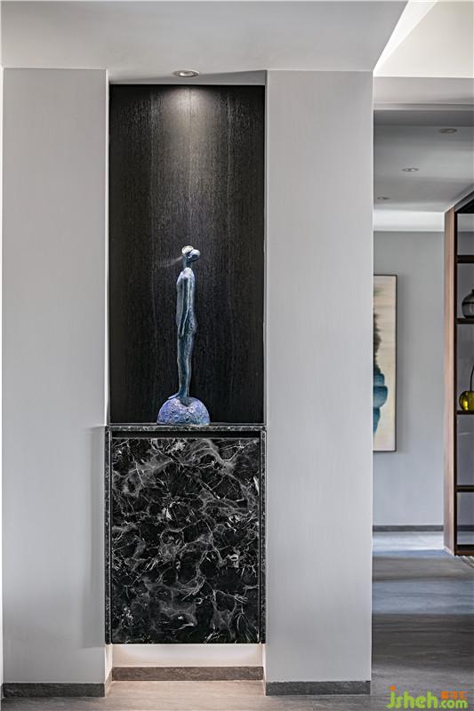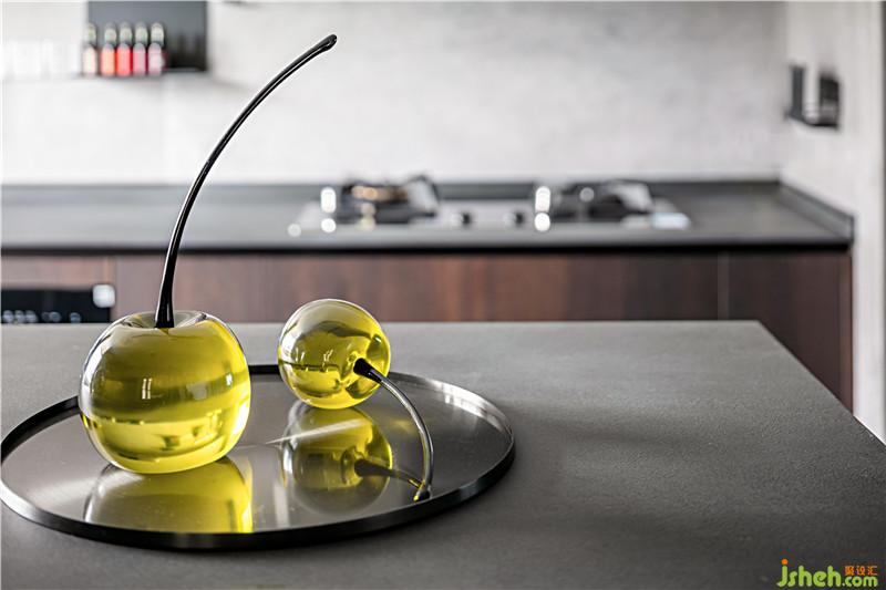灰色從客廳貫徹到廚房——意大利LAMINA太空黑至純廚臺,以及意大利LAMINA銀豹洗手臺,還有水泥灰大磚墻等營造出廚房工業(yè)風粗糙厚重的質(zhì)感,整個空間的氣質(zhì)——藝術(shù)、帥氣、野性。