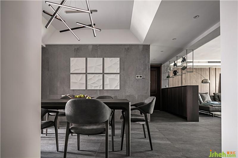 餐廳與客廳銜接,空間關(guān)系一目了然。整體空間層高2.7M,裝了中央空調(diào)后為2.4M。為了在視覺效果上拉伸層高,避免空間局促,餐廳主墻與地磚都是采用1500*700CM的大磚錯縫鋪貼。