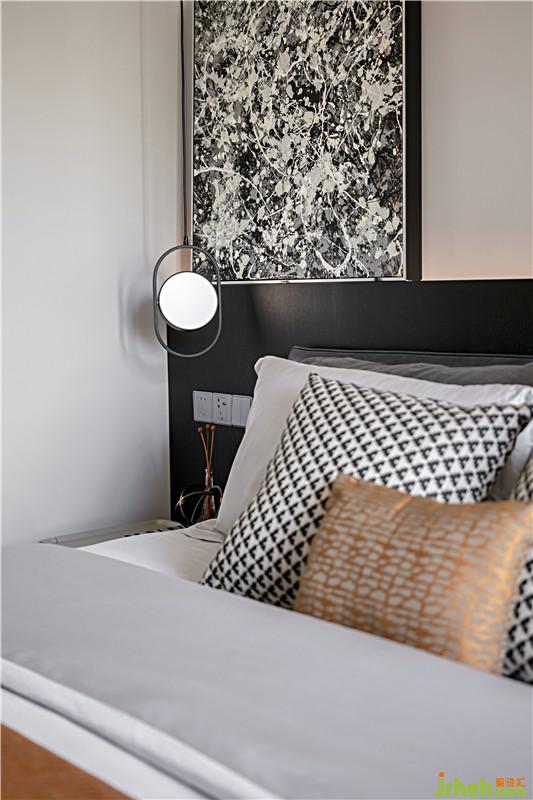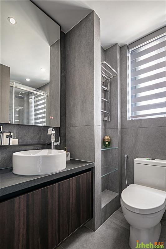 主衛(wèi)配合整體的設(shè)計格調(diào)——水泥灰色磚墻,紅褐色煙熏拉絲實木柜,還有幾處純白色裝置,簡單卻也別有一番清爽自然。