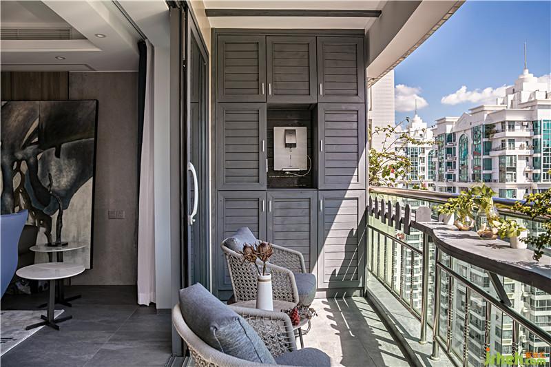 陽臺的一邊是一個灰色防腐木柜,陽臺整體色調(diào)與客廳協(xié)調(diào)。打開玻璃推拉門,陽臺透進(jìn),兩個空間形成整體,彼此融合。