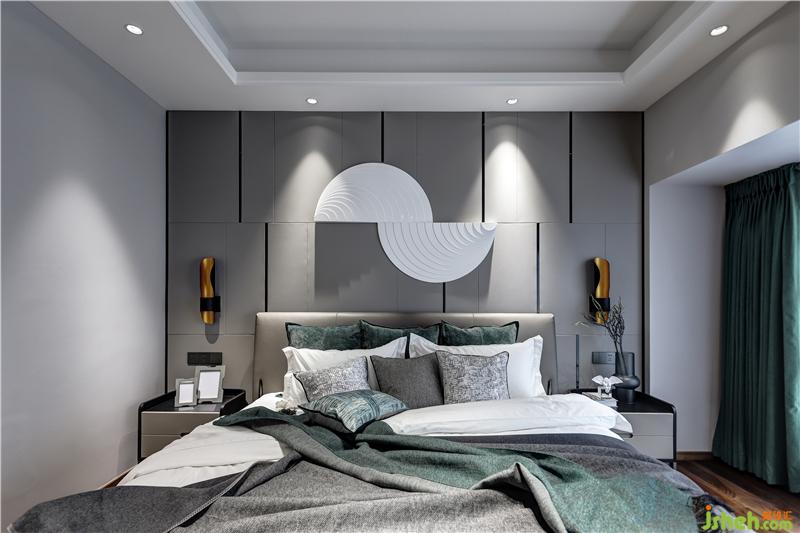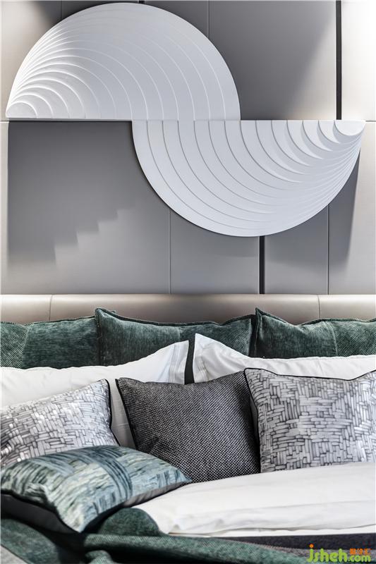 臥室恬靜溫潤的氣質(zhì),在高級灰背景里,映襯著一泓湖綠,讓人陷入柔軟舒適里感受一切令人歡喜的事物。