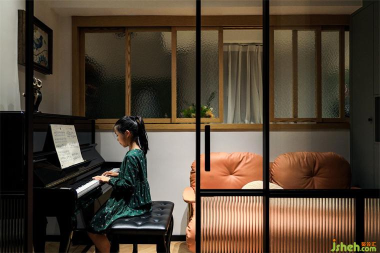 這個(gè)空間以前是客臥,沒(méi)有光線,通風(fēng)不好,現(xiàn)在改成半開(kāi)放的琴房,木框窗從兩面看,都像是把空間裝在了一幅畫里:《插花的女主人》、《練琴的孩子》,有時(shí)候發(fā)呆、閱讀、休息,極具包容性和互動(dòng)感。