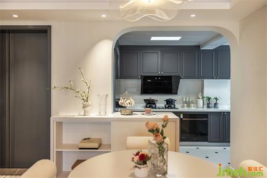 ① 裝修設(shè)計(jì)將廚房打開,做島臺(tái)餐桌,增強(qiáng)互動(dòng)性,同時(shí)讓整個(gè)空間變得更加寬敞,實(shí)用性更高;② 陽臺(tái)一分為二,一半功能,一半休閑,納入室內(nèi),擴(kuò)充廚房與客廳的面積;③ 保留主次臥兩間臥室,調(diào)整主臥門的位置,讓布局更加合理;④ 次臥做榻榻米床柜一體,集臥室、書房、收納于一體,實(shí)現(xiàn)空間功能多樣化。