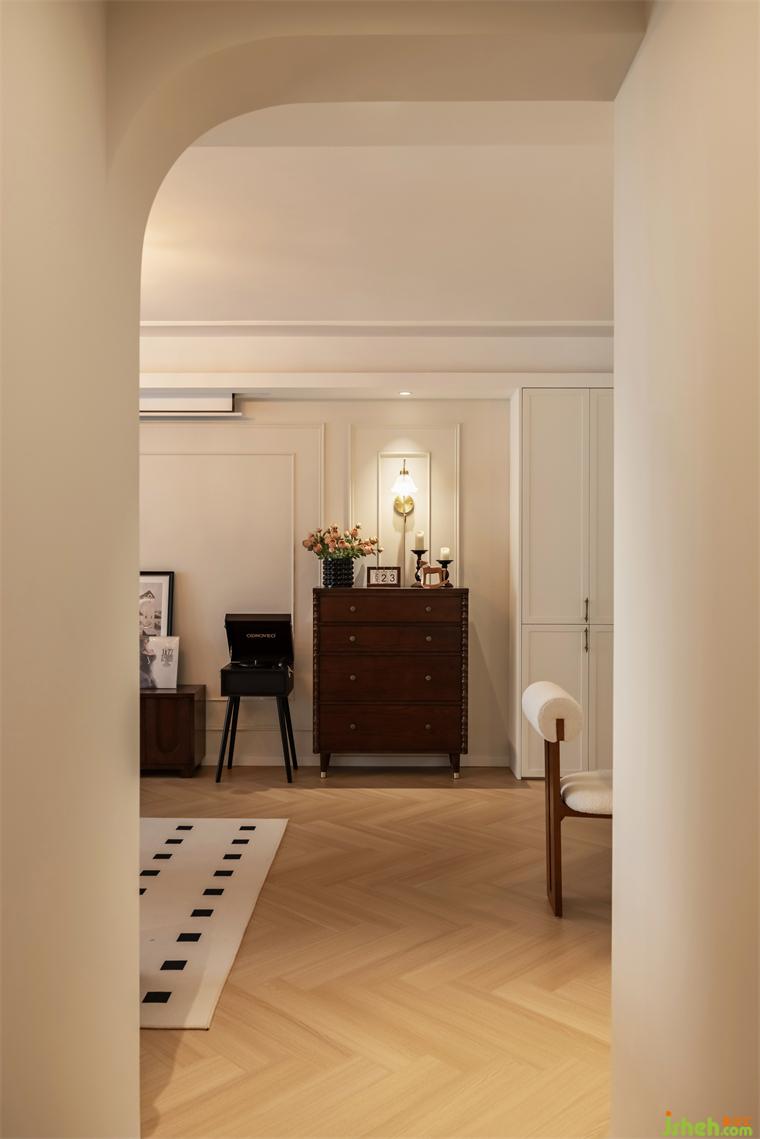 2.奶油白客廳通鋪人字拼木地板,墻面PU線搭配角花,弧形線面貫穿全屋,柔化空間氛圍,共同鋪貼法式風(fēng)的優(yōu)雅與浪漫。陽臺(tái)打通后,客廳不僅擁有了充沛采光,同時(shí)坐享絕佳的觀光視野,大落地窗搭配平拱門,讓這一隅成為屋主疲乏一天后自我放松的休閑小角落,養(yǎng)花種草、曬太陽、喝下午茶,是隨手都可以拍出雜志大片的程度。