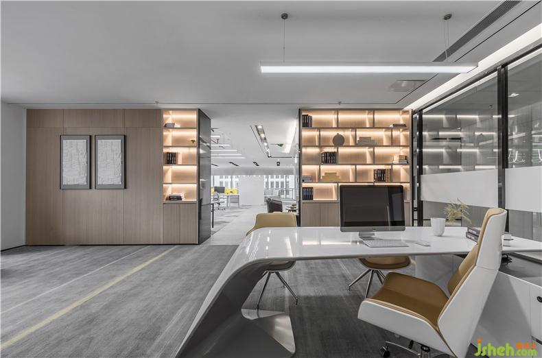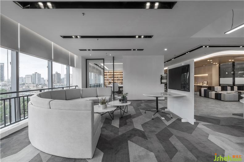 公共辦公區(qū)的設計,現(xiàn)代辦公桌的線狀與色調帶來強烈的視覺沖擊,辦公室設計線燈方格置物架以小型圖書角的姿態(tài)靜立在窗邊一隅,皆是推動人們高效工作的氛圍助力,科技感與未來感達到了統(tǒng)一。