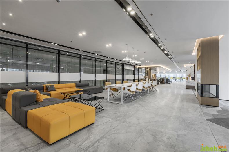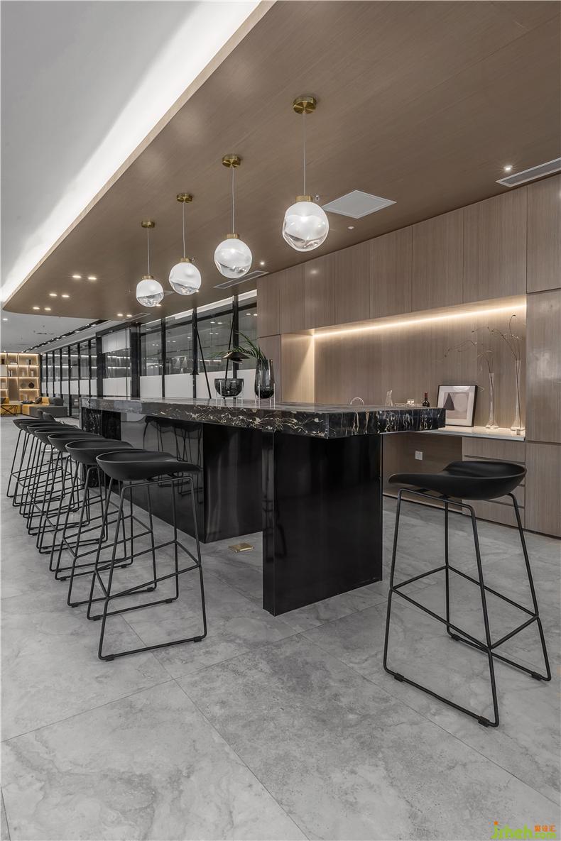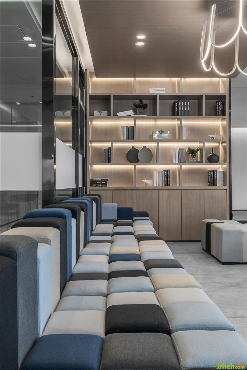 洽談區(qū)、水吧臺合理有序的排列,構筑出一個自由開放的場域,空間整體以大幅純粹的顏色搭配營造強烈的視覺感,設計借助簡潔凝練的藝術語言,運用幾何線條營造不拘一格、活力流動的至高質感,辦公室設計延展出空間流線型的視覺縱深體驗,詮釋科技元素與空間融合交匯的氛圍,清澈而純粹,此處作為員工和來訪者智慧辦公和休閑洽談區(qū),辦公室設計通過弧形具有圍合感沙發(fā)組合,開放性的水吧配套,自然光線下的辦公狀態(tài)下,人呈現(xiàn)出更自由精神愉悅的精神感受,充分滿足體驗者對于可移動式辦公的即時性需求。
