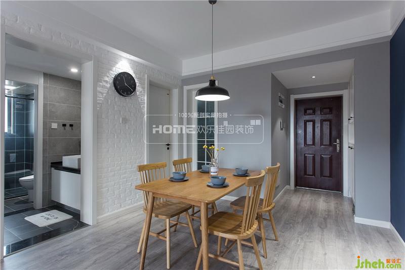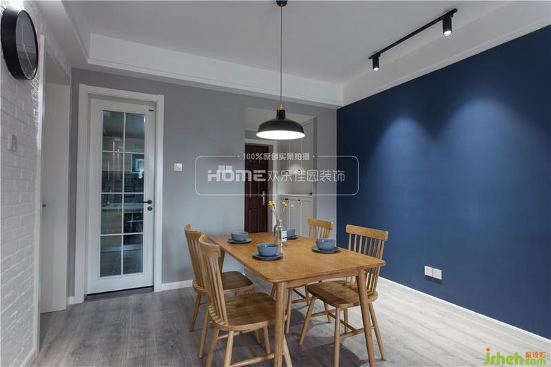 清新純凈的餐廳空間,室內設計師延續(xù)了客廳自然簡約的風格,一面藍、兩面灰和白、三點黑重組的空間,因造型簡單的原木色餐桌椅的加入,更具自然氣息。