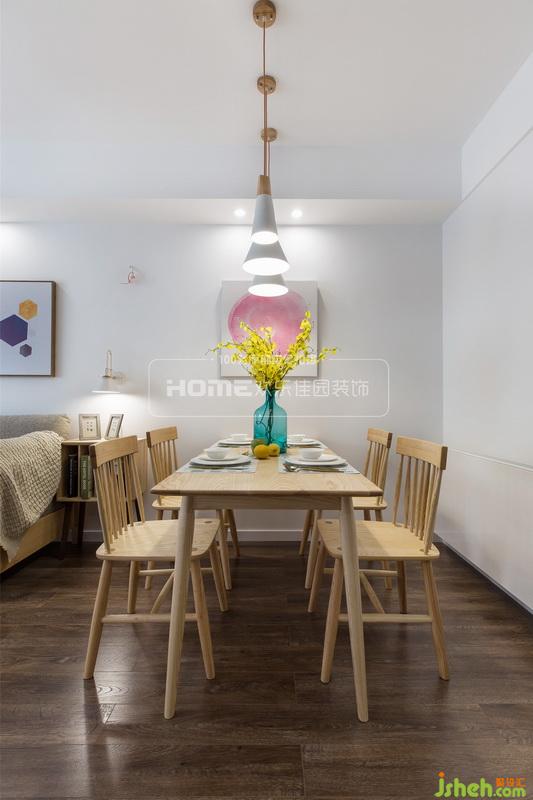 素凈的桌椅,實用的同時不失典雅大方,懸掛的精巧吊燈,投下純凈的光,藍色的玻璃花器是生活里的靈光。