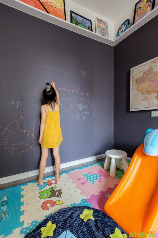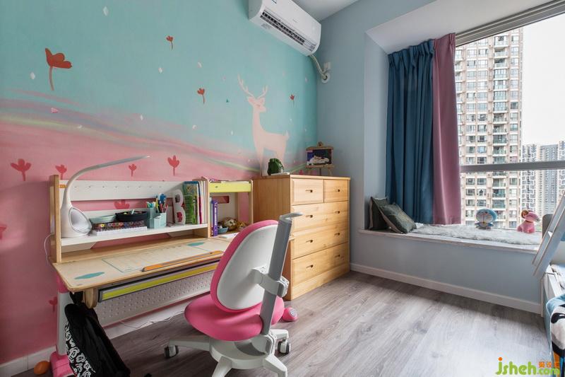 因為家里是兩個小公舉,所以室內設計師在色彩的搭配上,室內設計師選用的是粉紅、淡藍色,活潑鮮艷,簡潔明快,具有童話的意境。室內光線充足,簡單實用的書桌和儲物柜,讓兒童在自己的小天地里自由的學習生活。
