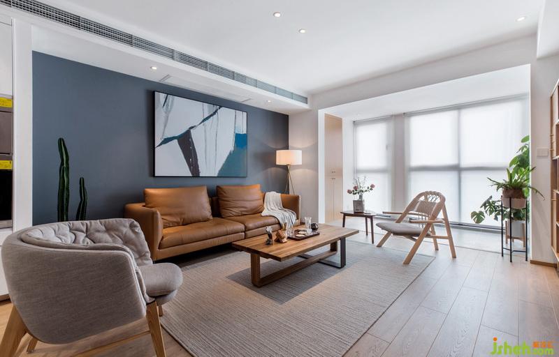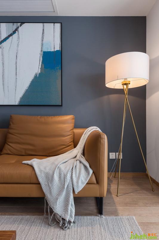 室內(nèi)設(shè)計(jì)師在客廳里每一個(gè)角落都是經(jīng)過精心布置的,家人希望給孩子成長的陪伴和空間,所以沒有電視柜的設(shè)計(jì);棕色皮質(zhì)沙發(fā)搭配原木色的茶幾,大象灰的背景板輔以一副現(xiàn)代簡約抽象畫,色彩對比鮮明,空間層次感十足。