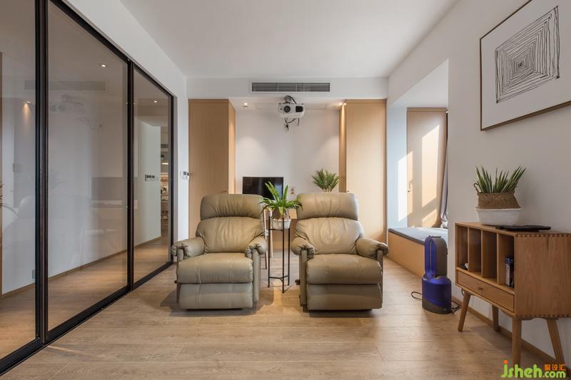 室內(nèi)設(shè)計師在影音室采用高品質(zhì)玻璃推拉門,有效的改善隔音效果,天花板吊頂和墻面都是運(yùn)用了吸音效果的裝修材料, 兼顧吸音與擴(kuò)散的功能;卡其色的皮質(zhì)沙發(fā)座椅,舒適又耐用,讓家人在觀看影片的時候更加的有韻味。