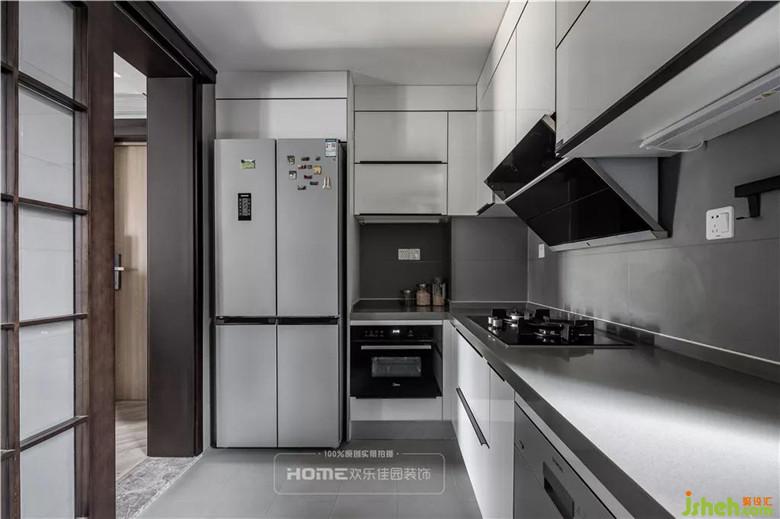 L型廚房布局,由原廚房和生活有陽臺打通合并而成,利用L型轉(zhuǎn)角的設計很好的節(jié)省空間,洗、切、炒完美的操作區(qū)域,流水線的整體設計,便利又美觀。