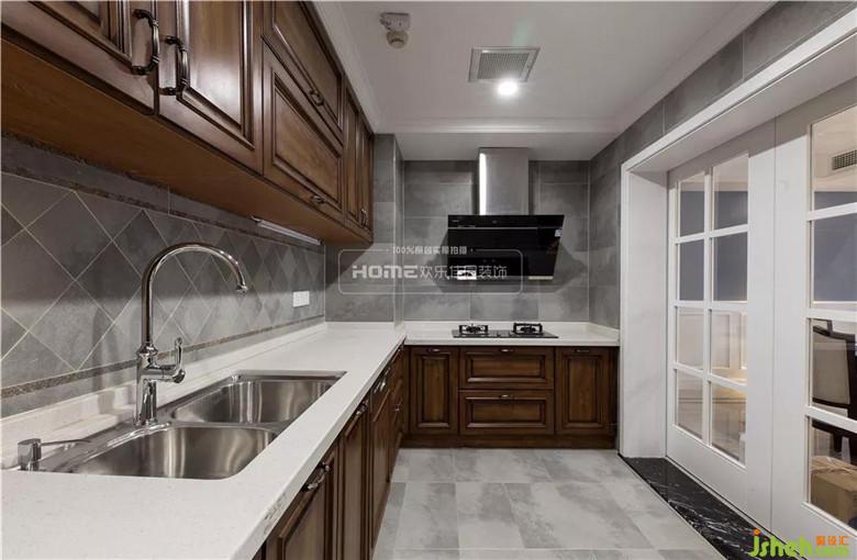 開敞的具有美式風(fēng)的廚房,具備強(qiáng)大而又簡(jiǎn)單耐用的廚具設(shè)備,有寬敞和足夠的操作臺(tái)面,在裝飾上也有很多小細(xì)節(jié),仿古墻磚,廚柜門板喜好用實(shí)木門扇。