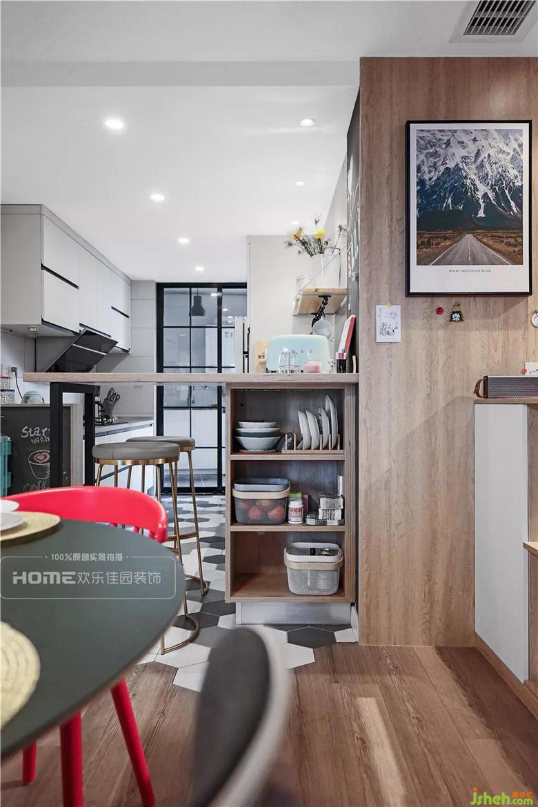 Miss張想要有個開放式的廚房,但由于原廚房面積偏小,需要重新規(guī)劃空間與空間之間的界定,設(shè)計(jì)師在廚房改造時做了放大處理,將廚房空間向生活陽臺外擴(kuò)一部分,此增彼減,把開放式廚房和餐廳形成一體的空間。