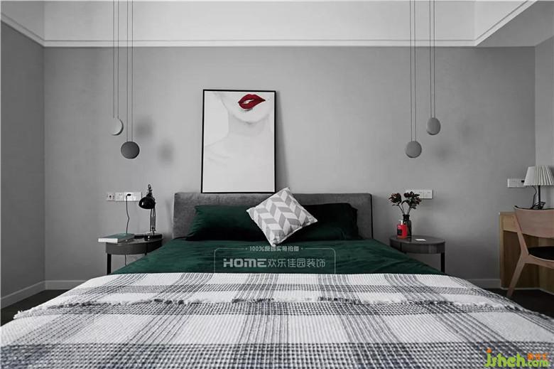 以簡潔的石膏板疊級線代替復(fù)雜的吊頂,以簡勝繁,從頂延直到床頭的照明燈,使室內(nèi)更具溫情。床品選擇穩(wěn)重的色調(diào)——墨綠色,活潑而富有朝氣,裝飾畫的大紅唇看一眼就讓人移不開眼睛。