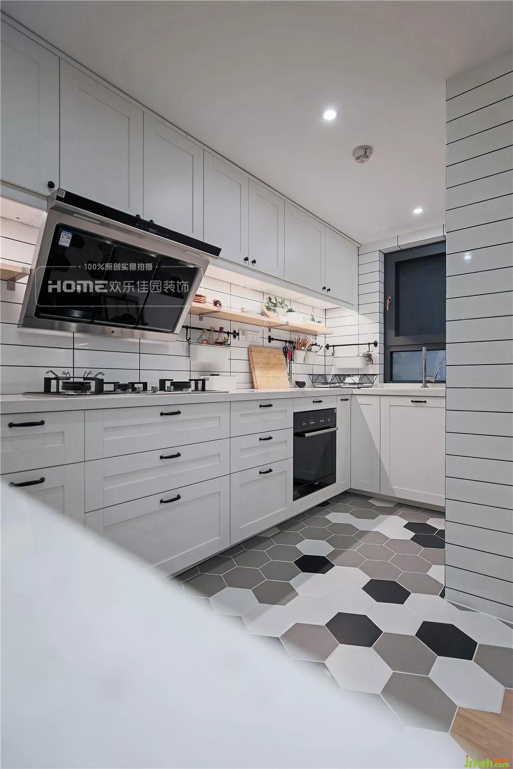黑白灰的六角磚從入戶一直延續(xù)到廚房,空間的連接性和延伸性得以最佳的展露。色彩單一的臺(tái)面和櫥柜,可以置放濮先生的茶愛(ài)好,也不至于搶了客餐廳的風(fēng)頭,反而增加了融入感。