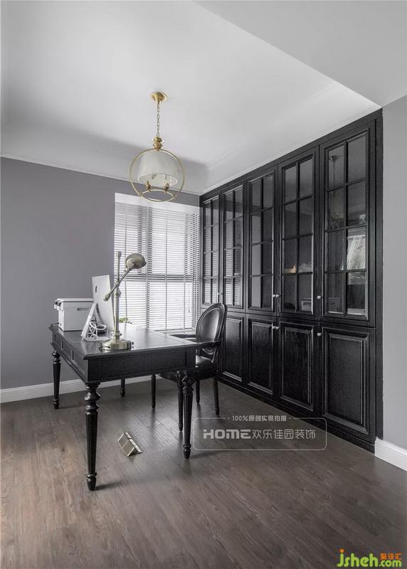 幽靜的書房空間,出于業(yè)主對深色家具的偏愛,依舊選擇黑色的書桌與書柜,濃重的色彩,簡約的布置,嵌入式書柜設(shè)計凸顯出主人的高雅與大氣。