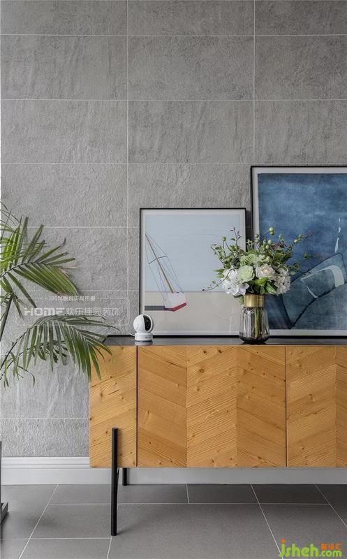空間開闊又與眾不同,鋪貼水泥灰的地磚和墻磚,大氣簡潔,大面積的落地窗,引入自然光線,搭配不同色系的魚骨拼端景柜,讓人產(chǎn)生意想不到的視覺效果。