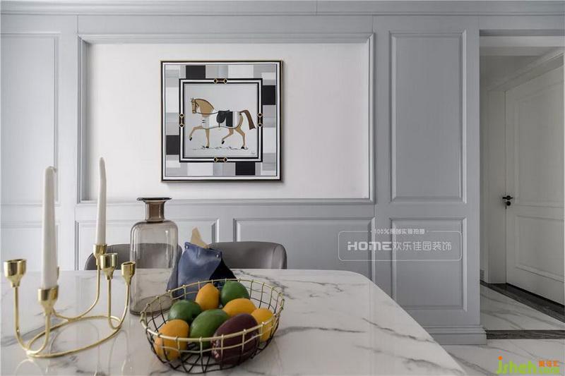 藍灰色的木飾面板,預留掛畫的操作空間,提升就餐檔次,再通過軟裝的擺件點綴,豐富空間層次。