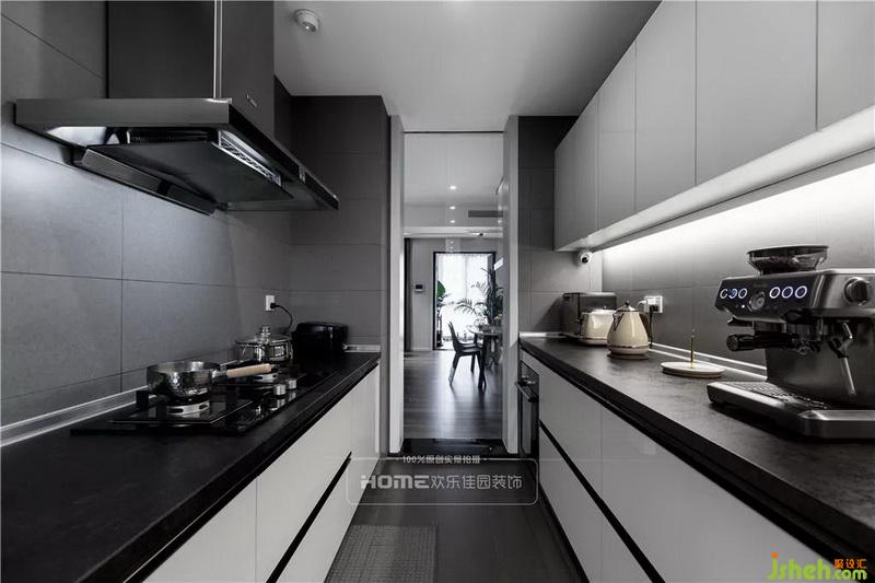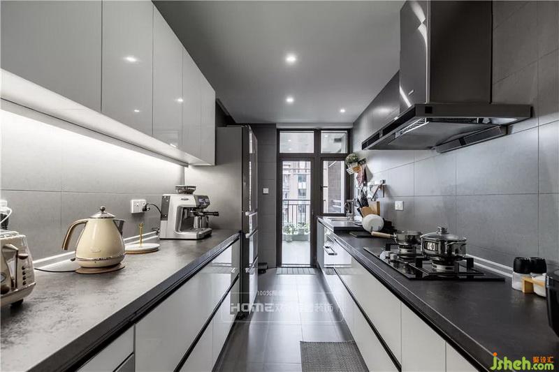 廚房空間大而寬敞,雙一字型的布局,一邊烹飪區(qū),一邊放置各種電器,上下兩排的櫥柜足夠收納他倆的生活需求。