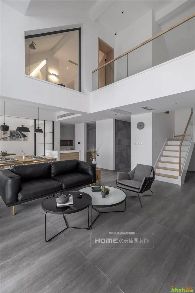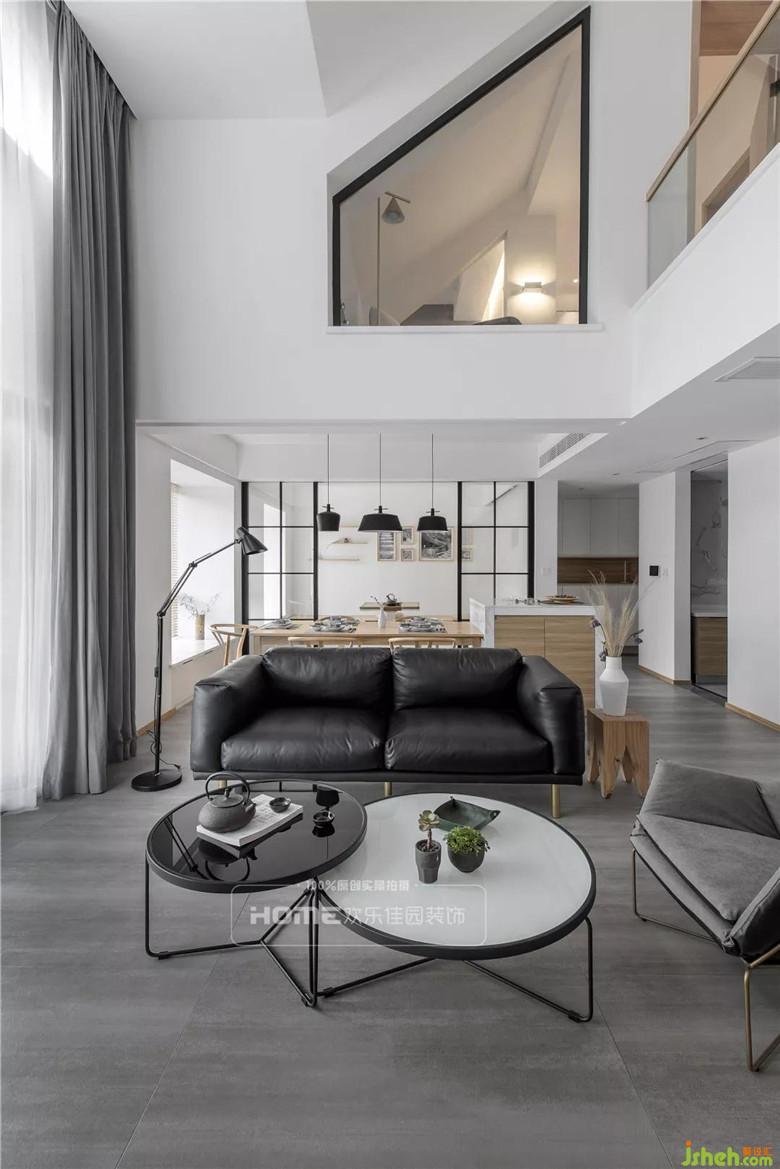 客廳是家庭成員的活動中心,一樓客廳是挑高空間,視覺上從平層空間轉化為立體空間,加上大窗戶帶來的開闊視野,有效的增大整個居住空間的采光??蛷d空間布局不追隨、不妥協(xié),不同材質的碰撞和疊加,追求的均是質樸的、回歸本真的設計。