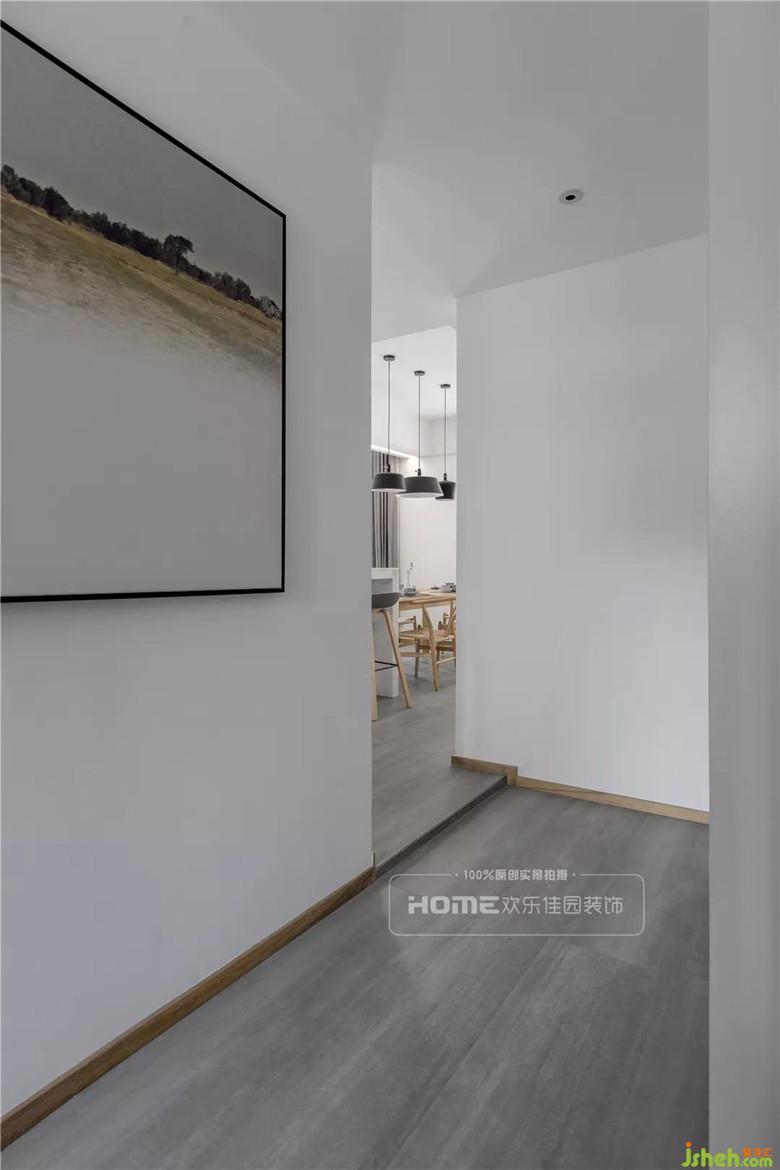 由于戶型是異形結構,入戶自然形成一個緩沖區(qū)域,簡單素雅的陳設,加之木質踢腳線、灰色地板平衡視覺,依稀可見的內里空間,有著“猶抱琵琶半遮面”的意境,透露著神秘與時尚感。
