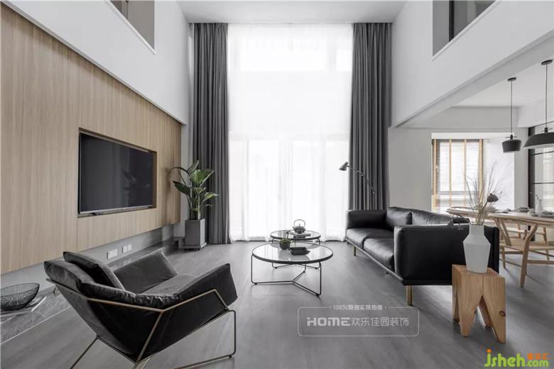 通過各種材質的形態(tài)組合,光與影的交織,肌理與形態(tài)的搭配,演繹了一種無限延展的自然之美。淺灰色地板與白色乳膠漆搭配大面積木質電視背景墻,構建一面質樸沉穩(wěn)的空間感,黑色皮質沙發(fā)與電視遙遙相望,打造一方寧靜安閑的悠悠居所。