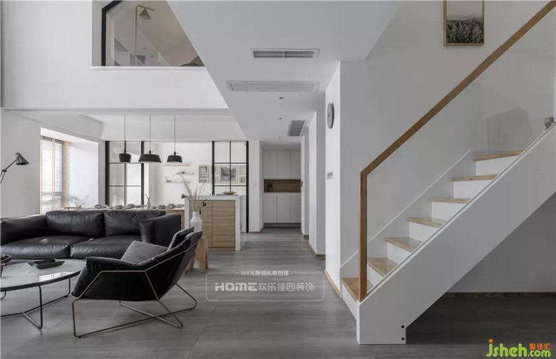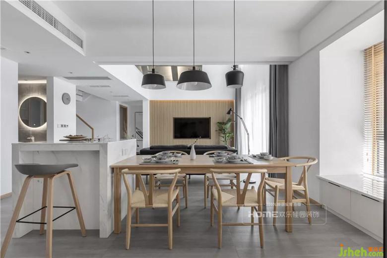 挑高戶型隔層下的空間作了餐廳和島臺的設計,與客廳相互連接和呼應,巧用家具劃分出空間功能,設計上保留了視覺的通透性,視角由餐廳島臺空間延伸至客廳,從而降低由于隔層帶來的壓迫感。
